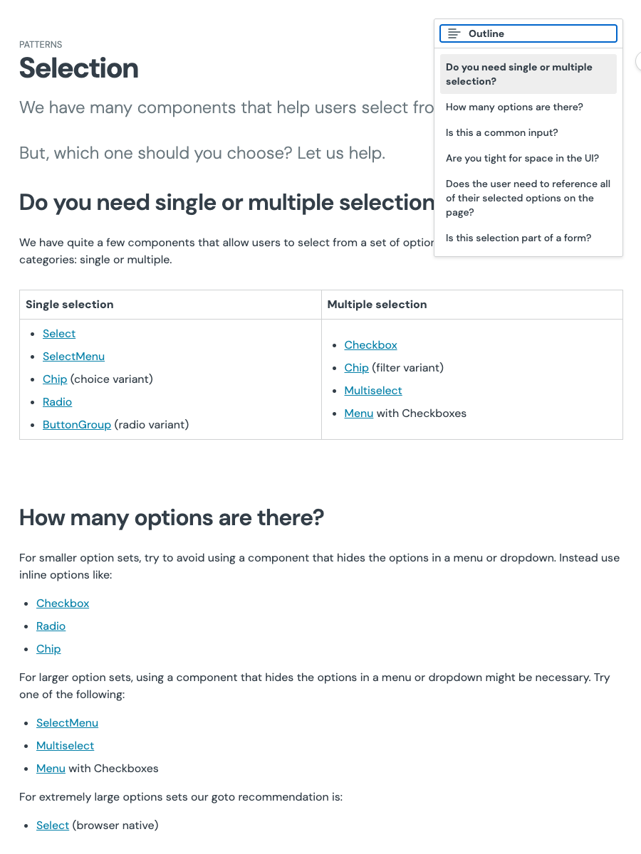 I was a contributor to the design docs site and published some well researched design guidelines. Like this one, helping designers decide which type of selection component they should choose based on the details of their use case.