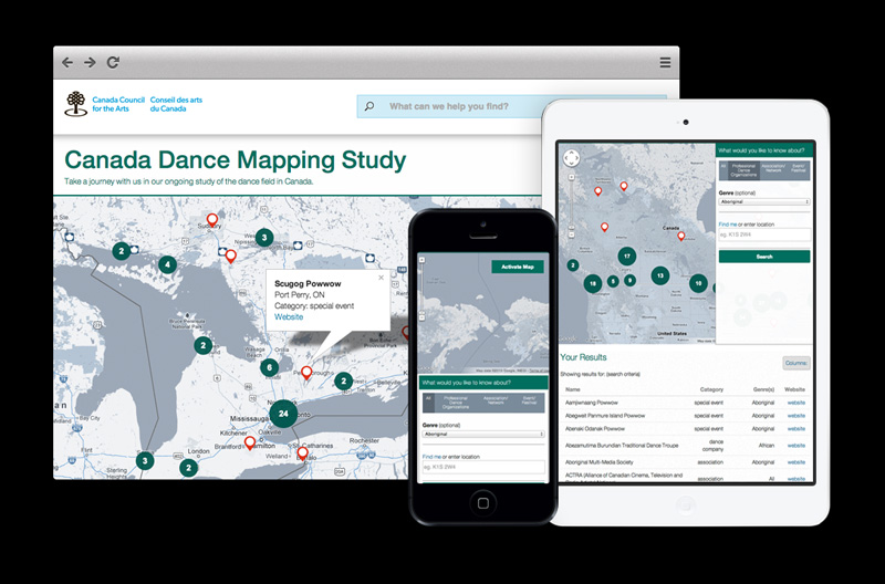 I worked on this mapping web app during my time at a creative agency. This project is a complex implementation of the Google Maps API that includes marker clustering and live filtering and it works across mobile and desktop devices. We worked with Canada Council of the Arts to turn their Dance related map data into an interactive responsive app.