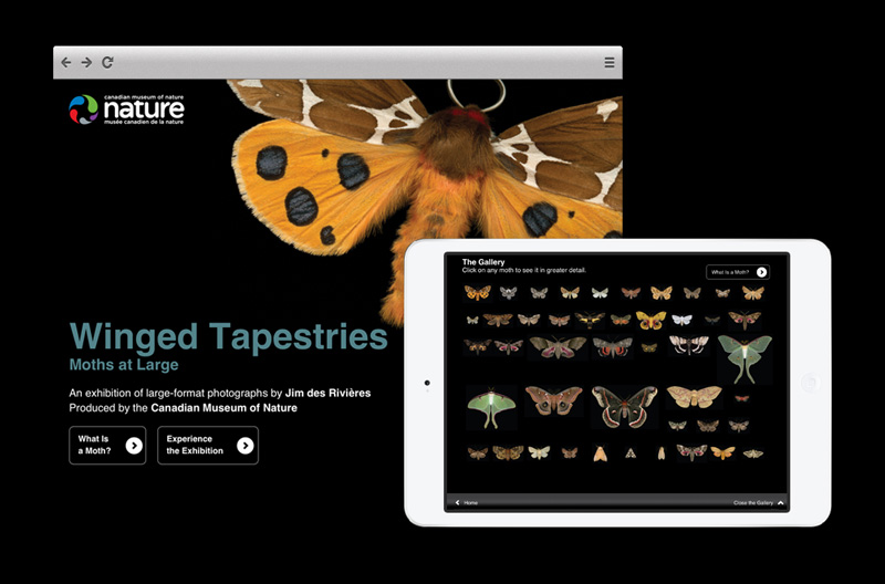 iOS/web app I developed during my time at a creative agency, for the Canadian Museum of Nature. This app features a series of interactive learning materials accompanied by 46 hi-res images of beautiful moths found in North America. This app was build to support a traveling art exhibit created by photographer Jim des Rivières and is available in the Apple App Store.